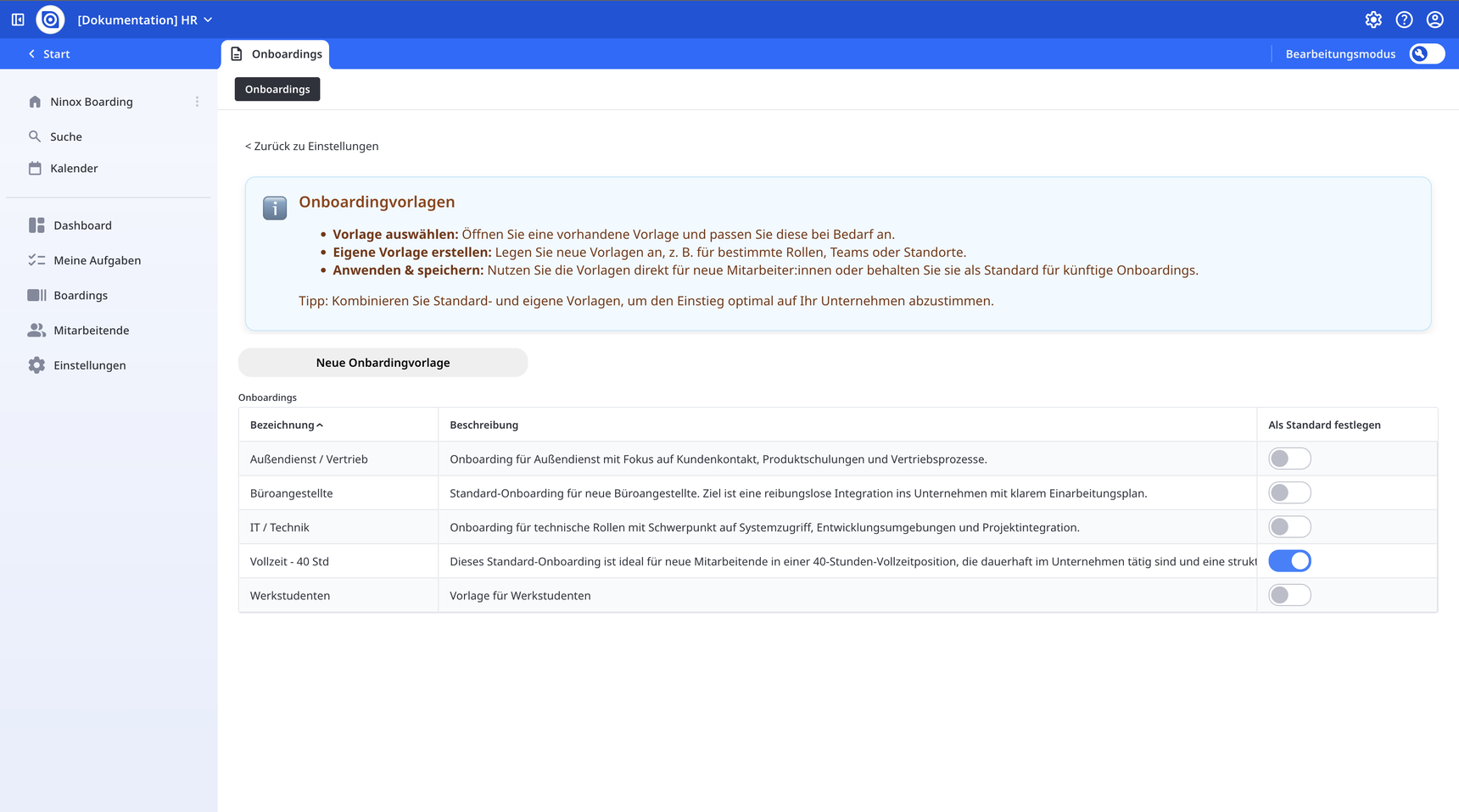 Über die Schaltfläche „Neue Boarding Vorlage“ können Sie neue Vorlagen anlegen. Jede Vorlage enthält eine Bezeichnung und eine Beschreibung, mit der Sie den Zweck und den Anwendungsbereich klar definieren. Typische Beispiele: