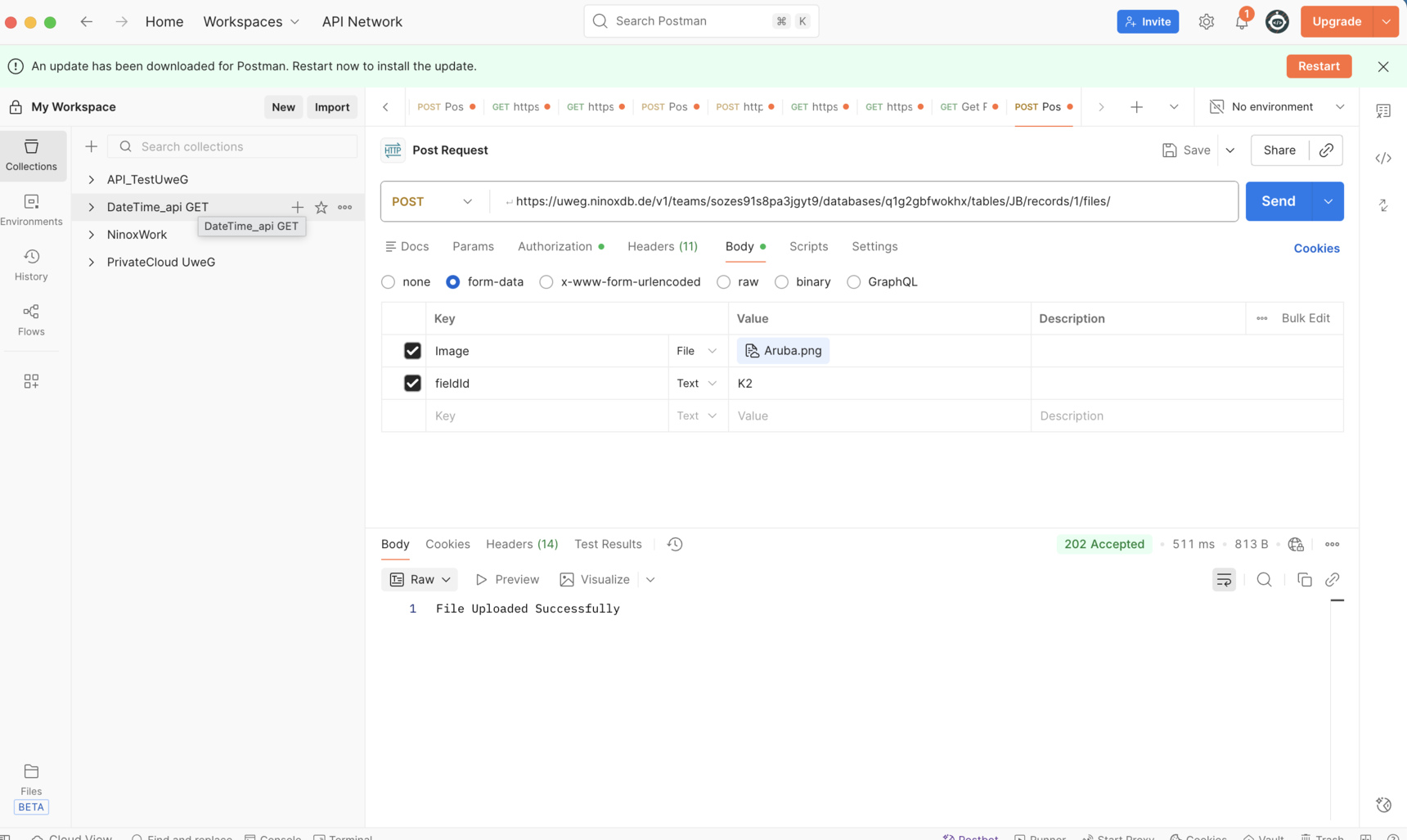 Anbei ein Screenshot, wenn man mit Postman den Upload in ein Bild/Image Feld testen möchte: