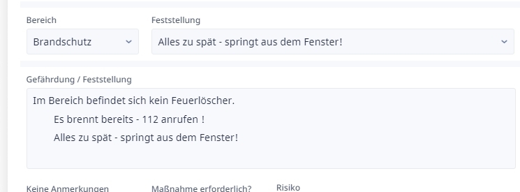 Nun möchte ich in einem Formular mit einem Dropbox-Feld den Bereich wählen (z. Beispiel Brandschutz) und er zeigt mir im Feld daneben (Feststellung) alle Einträge an, die dem Bereich Brandschutz zugeordnet sind.