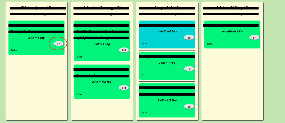 let woche := KW; let myDate := text(Datum); let colorWochentag := color(Wochentag); let kolonnen := (select Kolonnenplanung)[text(Planungsdatum) = myDate]; let kopla := kolonnen.text(Mitarbeiter); let tab := ((select Listen) order by Reihenfolge)[text(Planungsdatum) = myDate]; let mitarbeiter := (select Mitarbeiter).number(Nr); let kolonneTag := for i in kolonnen do { name: i.text(Mitarbeiter), auto: i.text(Fahrzeuge), idMit: i.Nr, job: tab[i.text(Mitarbeiter) = text(Kolonne)].{ id: Nr, kunde: Kunde.Name, adresse: Projektadresse, aufgabe: text(Aufgaben), aufgaben: concat(for i in numbers(Aufgaben) do record(Aufgaben,i).icon(Aufgabe) end), arbeit: text(Arbeiten), anzahl: AK, farbe: Farbe, zeit: text(Zeitansatz), arbeiter: text(Kolonne), reihenfolge: Reihenfolge, notiz: if Notizen then Notizen else "" end, stunden: Zeitansatz, erledigt: '_erledigt am' } } end; let kunden := for i in tab do { id: i.Nr, kunde: i.Kunde.Name, adresse: i.Projektadresse, aufgaben: i.text(Aufgaben), anzahl: i.text(AK), arbeitskraft: i.number(AK), zeit: i.text(Zeitansatz), stunden: i.number(Zeitansatz), arbeiter: i.text(Kolonne), notiz: i.Notizen } end; let anzahl_kolonnen := cnt(kolonneTag); let css := " <style> .grid-container { display:grid; grid-template-columns:repeat(auto-fill,18em); grid-gap:1em; } .gridform{ font-size:0.85em; border-radius:.5em; padding:1em; box-shadow:2px 2px dimgray; color:black; background-color:" + colorWochentag + "; } /* Die beiden Hover für Popup Kunde/Kolonne */ .jump1:hover{ cursor:pointer;background-color:#bbddbb; } .jump5:hover{ cursor:pointer;background-color:#fff; } /* Form des Projektcontainers */ .projekt{ padding: 5px 10px; border-radius: .5em; } /* Button für erledigt */ .btn{ position: relative; left: 160px; width: 40px; height: 20px; font-size: 11px; text-align: center; border-radius: 80%; cursor: pointer; } /* Weitere Infos zu den Kunden werden beim Mouseover angezeigt*/ .hide { display: none; } .myDIV:hover + .hide { display: block; color: black; } </style>"; let script := " <script> function maketrue() { database.update('" + raw(Nr) + "', '" + idOfYN + "' , '" + true + "'); } </script>"; let content := --- <aside class=grid-container>{ for i in kolonneTag do } <aside class=gridform><h2 style=text-align:center class=jump1 onclick=ui.popupRecord('{ i.idMit }')>{ i.name } ({ cnt(i.job) })</h2> <p style=text-align:center>{ i.auto }</p>{ for j in i.job do let idOfYN := fieldId(j.erledigt); } <hr> <div class=projekt style=background-color:{ j.farbe }> <h3 style=font-size:12px class=jump5 onclick=ui.popupRecord('{ j.id }')>{ j.kunde } - { j.adresse }</h3> <p style=text-align:center><b><i>{ j.anzahl } AK = { j.zeit }</i></b></p> <button class=btn onclick=maketrue()>Erl</button> <div class=myDIV>Info</div> <div class=hide> <p style=color:black>{ j.aufgabe }</p> <p><i>{ j.arbeit }</i></p> <p class=p1>{ j.notiz }</p> </div> </div>{ end } </aside>{ end } </aside> ---; html(css + script + content)Ich denke, die fieldId muss in der j-Schleife bestimmt werden.