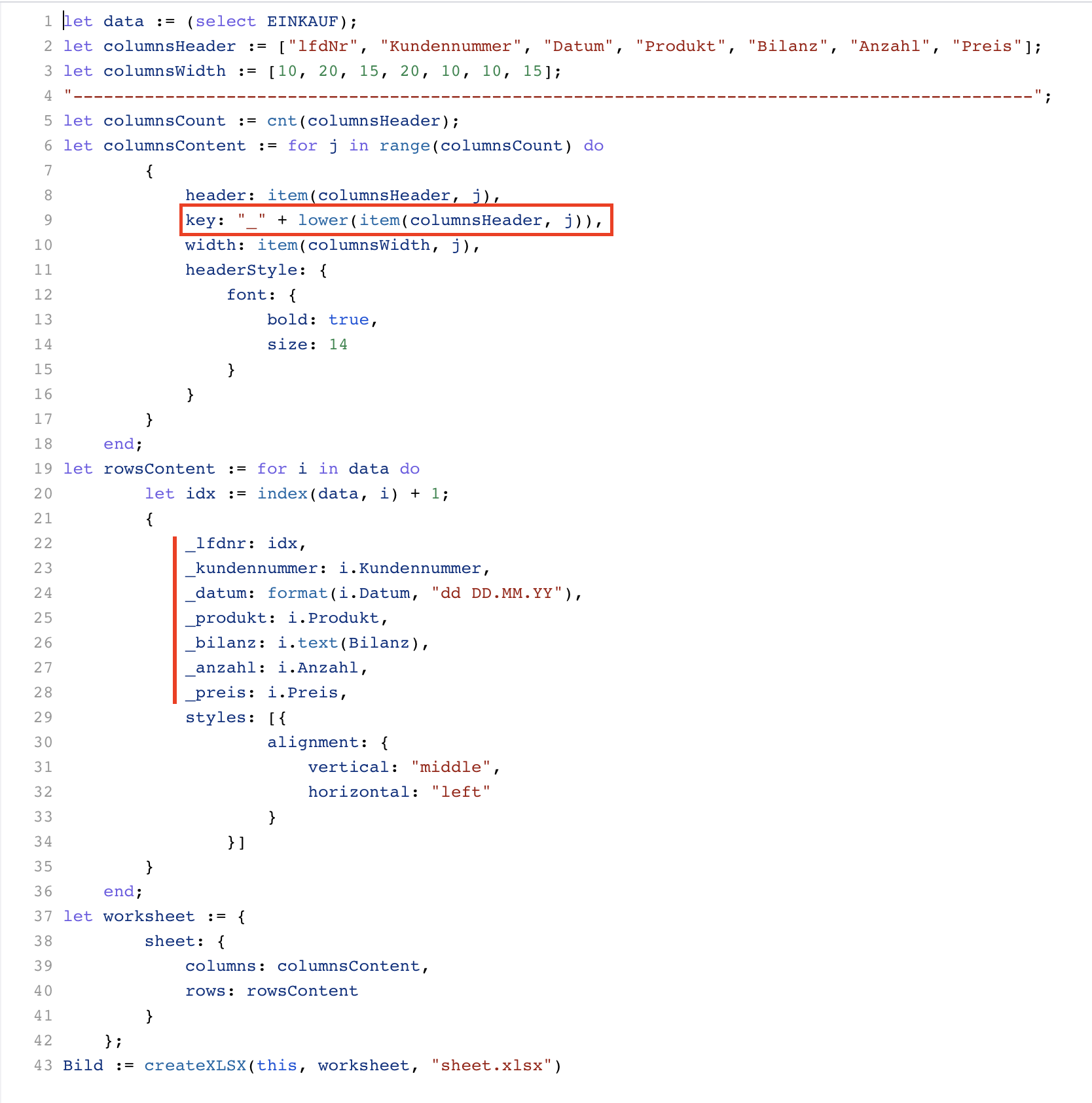 let data := (select EINKAUF); let columnsHeader := ["lfdNr", "Kundennummer", "Datum", "Produkt", "Bilanz", "Anzahl", "Preis"]; let columnsWidth := [10, 20, 15, 20, 10, 10, 15]; "----------------------------------------------------------------------------------------------"; let columnsCount := cnt(columnsHeader); let columnsContent := for j in range(columnsCount) do { header: item(columnsHeader, j), key: "_" + lower(item(columnsHeader, j)), width: item(columnsWidth, j), headerStyle: { font: { bold: true, size: 14 } } } end; let rowsContent := for i in data do let idx := index(data, i) + 1; { _lfdnr: idx, _kundennummer: i.Kundennummer, _datum: format(i.Datum, "dd DD.MM.YY"), _produkt: i.Produkt, _bilanz: i.text(Bilanz), _anzahl: i.Anzahl, _preis: i.Preis, styles: [{ alignment: { vertical: "middle", horizontal: "left" } }] } end; let worksheet := { sheet: { columns: columnsContent, rows: rowsContent } }; Bild := createXLSX(this, worksheet, "sheet.xlsx"). . . let worksheet := { sheet: { columns: columnsContent, rows: rowsContent }, sheetOfMax: { columns: columnsContent, rows: rowsContent[_preis = max(rowsContent._preis)] }, sheetOfSunday: { columns: columnsContent, rows: rowsContent[contains(text(_datum), "So")] } }; Bild := createXLSX(this, worksheet, "sheets.xlsx")