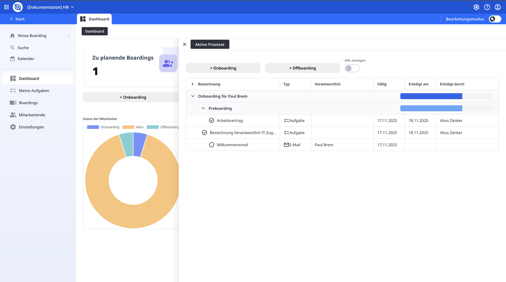 Der Bereich „Aktive Prozesse“ zeigt alle laufenden On- und Offboardings im Unternehmen. Er dient als zentrale Arbeitsübersicht für HR, Führungskräfte und beteiligte Rollen, um den Fortschritt von Aufgaben zu überwachen, Verantwortlichkeiten einzusehen und Engpässe schnell zu erkennen.