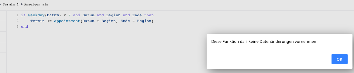Die Fehlermeldung im letzten Teil sagen Dir, dass in Formelfeldern keine Datenänderungen vorgenommen werden können durch Termin:= soll ein Feld beschrieben werden. Das geht nur in Triggern und Button. Mirko