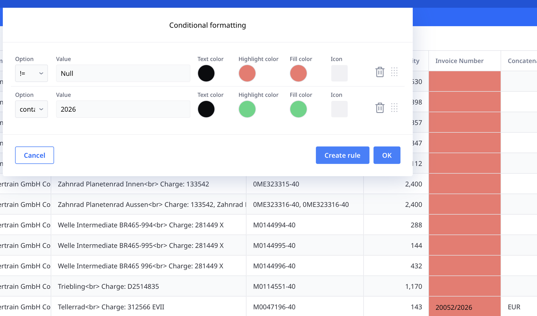 Ich möchte wenn nichts deinen steht bei Invoice Number das es Rot ist, und wenn eine Nummer drinnen Steht grün ist