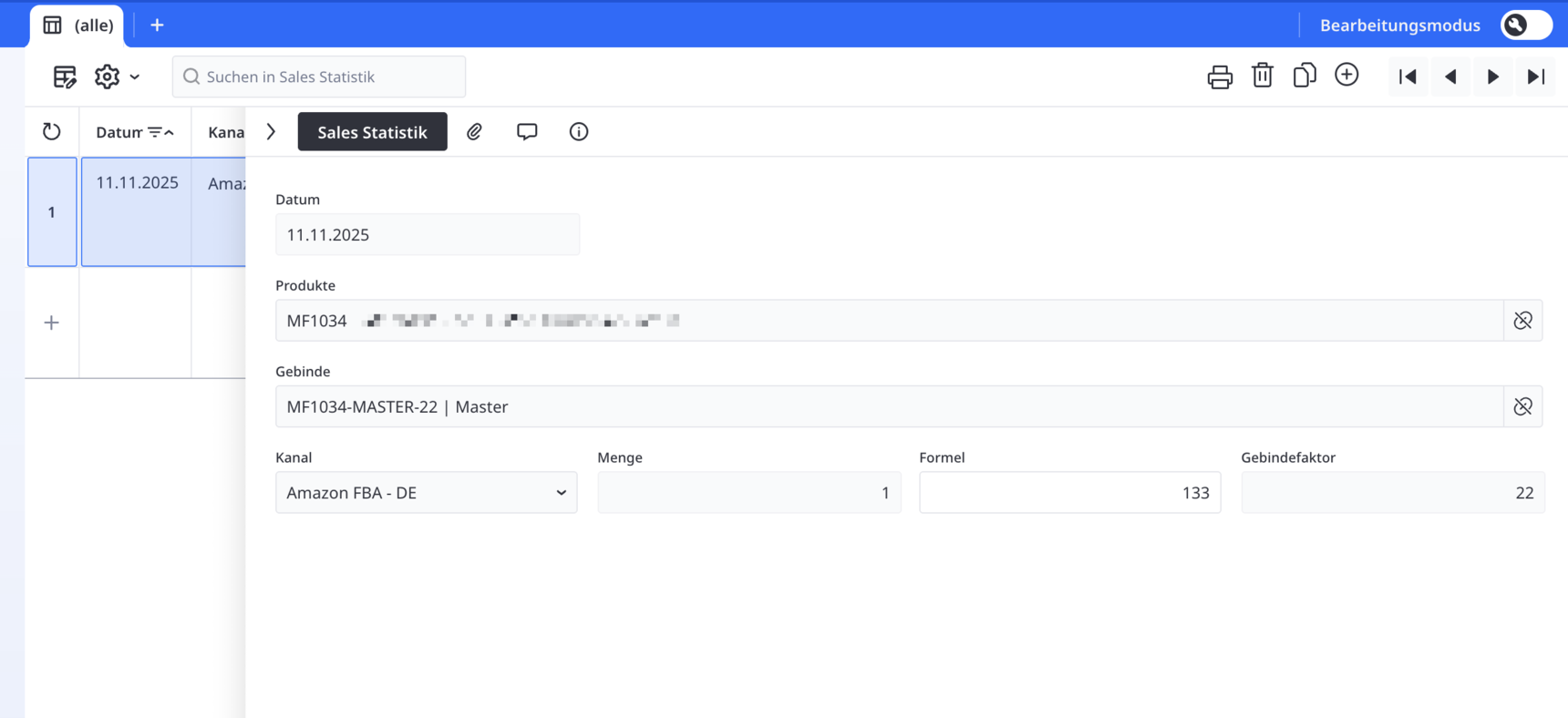 Dann habe ich eine Statistiktabelle "Sales Statistik", die ist verknüpft mit "Produkte" (n:1) und "Gebinde" (n:1)