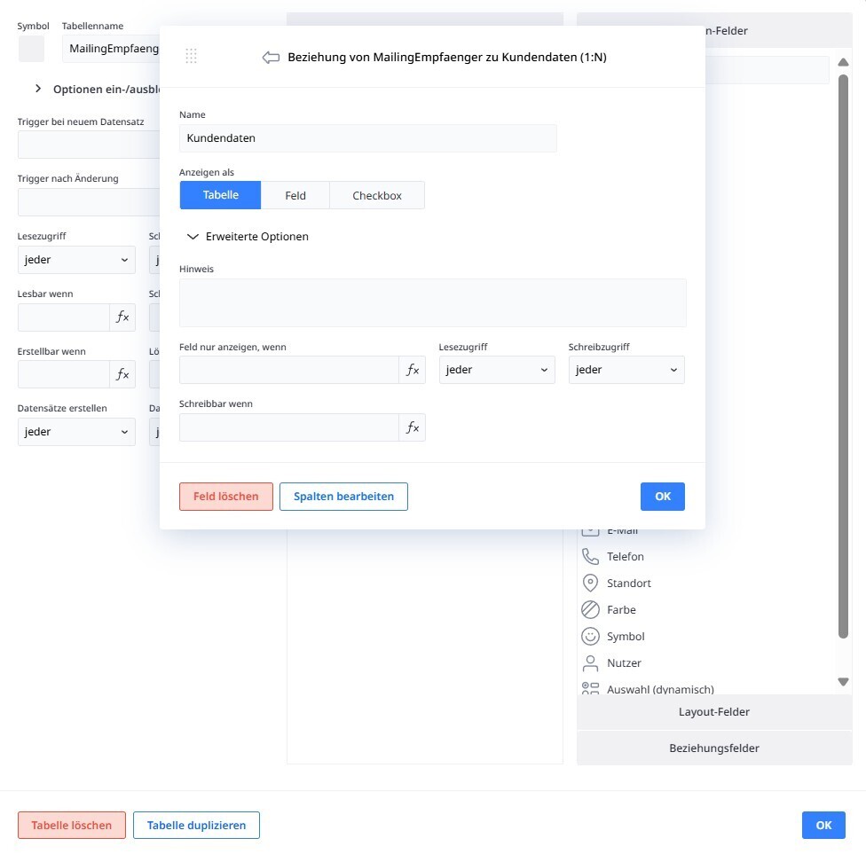 Hallo in die Runde, ich habe folgendes Problem: Tabelle Kundendaten enthält alle Kundendatensätze. Es gibt schon einige weitere Tabellen und Untertabellen - bisher keine Probleme. Identifikation läuft überall über eine KundenID. Nun importiere ich Datensätze in eine neue Tabelle. Diese Tabelle enthält Kundendatensätze, die ein bestimmtes mailing erhalten und auch die entsprechende KundenID. Ich schaffe es nicht, die Tabellen zu verknüpfen. Ich habe es mit Button und Formel versucht, mir wird immer wieder angezeigt, dass Kundendaten kein normales Textfeld ist. Ja, es ist mein Beziehungsfeld. Aber wie kann ich dann - wenn ich es über das Beziehungsfeld nicht machen kann - stattdessen verknüpfen? Ich bin ratlos... DANKE für Eure Hilfe