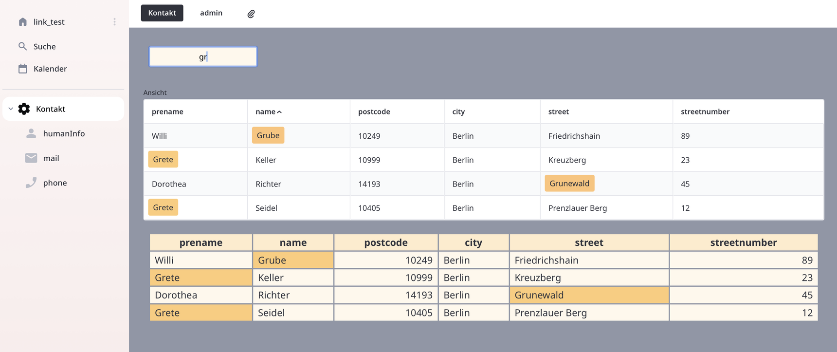 Zur Erklärung des Datenmodells: "Kontakt" ist eine Page und "humanInfo" ist eine Untertabelle in Komposition, die wiederum "mail" und "phone" als Untertabelle in Komposition besitzt. Habe darüber gelesen und wollte es mal ausprobieren. Demzufolge verzichtet der Code in der Ansicht auf select. Gesucht wird nur nach den Suchitems am Anfang der Wörter. Also "Burgruine" wird nicht gefunden. Ist so gewollt bei mir. Gruß Mirko