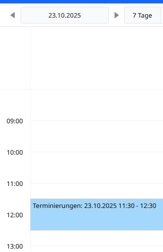 Termin := appointment(start, 1800000)Bei Eingabe von 23.10.2025 und 11:30 Uhr in einem Terminfeld, wird ein Termin am 23.10.2025 von 11:30 bis 12:30 im Kalender angezeigt.