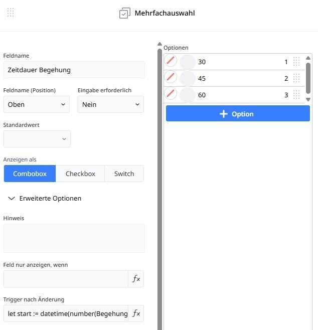 Ich empfehle dir ein Auswahlfeld zu benutzten, nicht wie in deinem Beispiel oben ein Mehrfachauswahlfeld. Dann lösche den Trigger im Terminfeld und lege im Auswahlfeld bei "Trigger nach Änderung" (wie du es ja schon gemacht hast) den folgenden Code.