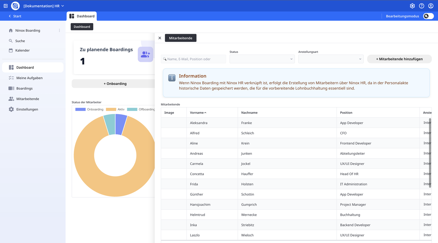 Wenn Ninox Boarding mit Ninox HR verknüpft ist, erfolgt die Erstellung von Mitarbeitenden ausschließlich über Ninox HR.