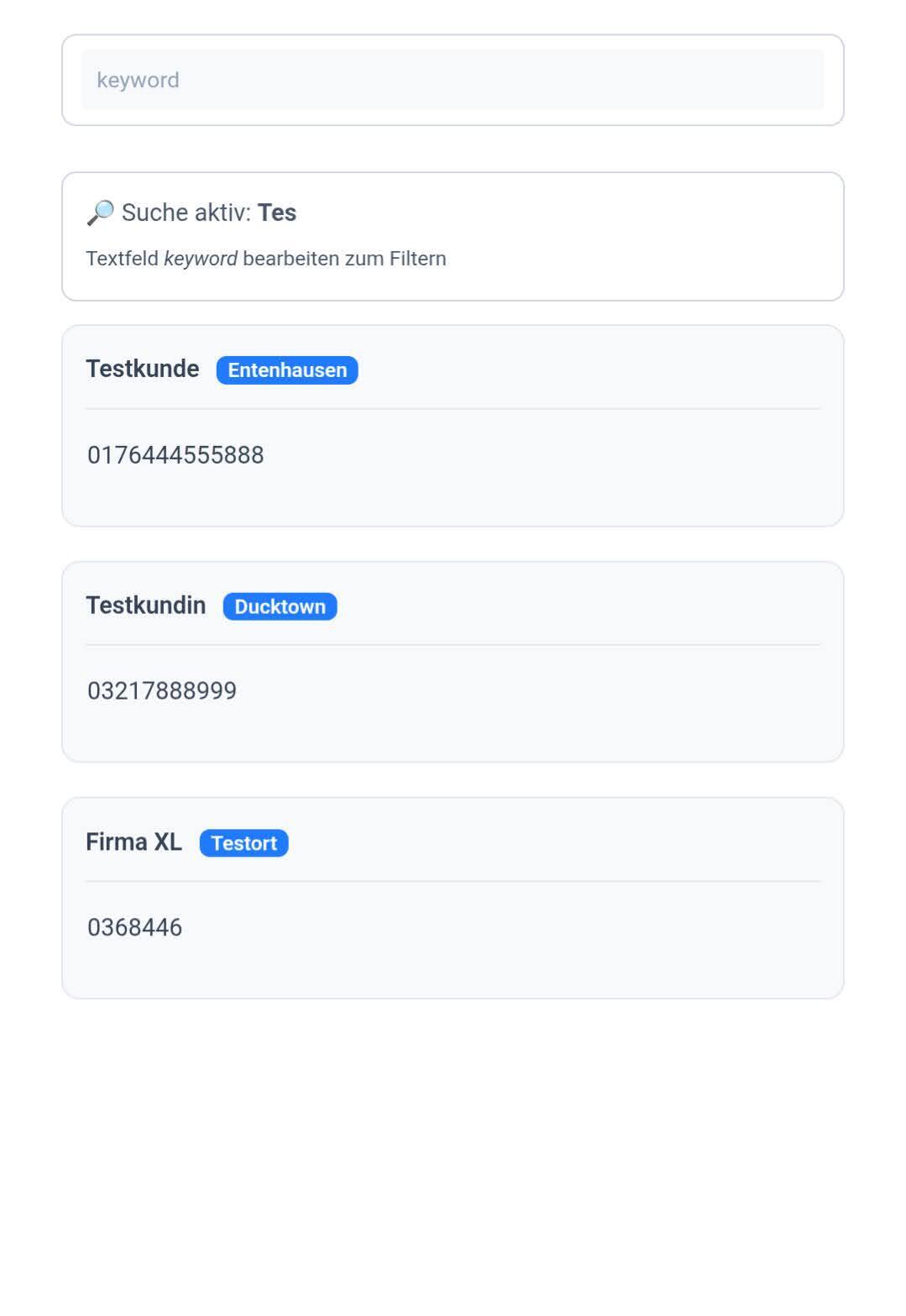 let input := keyword; let chosenData := (select Kunden where not input or contains(lower(Anzeigename), lower(input)) or contains(lower(Ort), lower(input))); let css := "<style> body { font-family:system-ui, sans-serif; } .ui-box { background:#ffffff; border:1px solid #d0d7e2; border-radius:8px; padding:10px 12px; margin-bottom:12px; font-size:13px; color:#475569; } .gridFirst { display:grid; grid-template-columns:repeat(auto-fill,minmax(20em, 1fr)); column-gap:12px; row-gap:18px; } .gridSecond { display:grid; grid-template-columns:auto 1fr auto; grid-template-rows:auto max-content; } .gridFormHead { font-weight:600; color:#334155; margin-bottom:4px; font-size:13px; } .gridFormAll { background:#f8f9fb; border:1px solid #e3e8ef; font-size:13px; padding:12px; border-radius:10px; color:#475569; text-align:left; transition:all .12s ease; } .gridFormAll:hover { cursor:pointer; box-shadow:0 2px 5px rgba(0,0,0,0.05); border-color:#cbd5e1; } dt { font-variant:small-caps; color:#64748b; font-size:12px; } de { margin:auto auto auto 1px; text-align:left; color:#334155; } dd { text-align:right; margin:1px; } hr { border:none; border-bottom:1px solid #e2e8f0; margin:8px 0; } .pill { border-radius:.5em; background-color:#1f7aff; color:white; padding:1px 6px; font-size:11px; margin-left:6px; } </style>"; let body := --- <div class='ui-box'>Suche aktiv: <b>{ keyword }</b><br> <span style='font-size:11px;'>Textfeld <i>keyword</i> bearbeiten zum Filtern</span> </div> <aside class='gridFirst'>{ for chosenData in chosenData do } <aside class='gridFormAll'> <aside class='gridFormHead'> <span onclick=ui.popupRecord('{ chosenData }')>{ chosenData.Anzeigename } <span class='pill'>{ chosenData.Ort }</span> </span> </aside> <hr> <dl class='gridSecond'> <de>{ chosenData.Telefon }</de> </dl> </aside>{ end } </aside> ---; html(css + body)