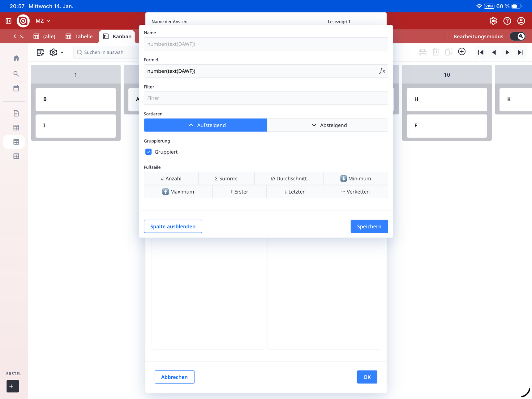 Hallo Wolfgang. Wenn du nicht nach der Id, sondern nach den Werten des Dchoice-Felds sortieren willst, dann mußt du dies in den Kanban-Einstellungen direkt eingeben. Erst den Wert mit text() auslesen, dann den Typ in Zahl mittels number() umwandeln und aufsteigend sortieren wie im Bild. Mirko