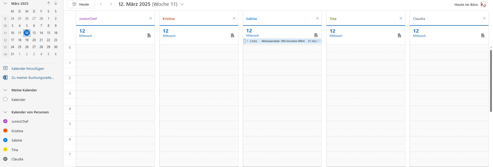 Hallo Sotirios, ich melde mich wieder, weil ich noch immer nicht das Problem mit dem Kalender gelöst habe. Kannst du mir vielleicht dabei helfen. Ich brauche eine Datenbank, die ähnlich funktioniert wie der Outlook-Kalender. Ich habe 5 Mitarbeiter und benötige für jeden Mitarbeine eigene Spalte die von oben nach unter verläuft mit den Tageszeiten von 7.30 Uhr bis 19.00 Uhr. Ich möchte in der Spalte von Mitarbeiter 1 einen Termin eintragen. Und wenn es notwendig ist, diesen Termin auch in andere Spalten verschieben können (so sie im Outlook.) Ich habe eine Kundendatei bereits bei Ninox und arbeite damit seit ein paar Jahren, aber das programmieren des Kalenders macht mir Schwierigkeiten. Kannst du mir da helfen? Derzeit arbeite ich mit dieser Ansicht im Microsoft 365, aber es gibt immer wieder Probleme mit der Syncronisation, deshalb möchte ich auf Ninox mit einem Kalender arbeiten.